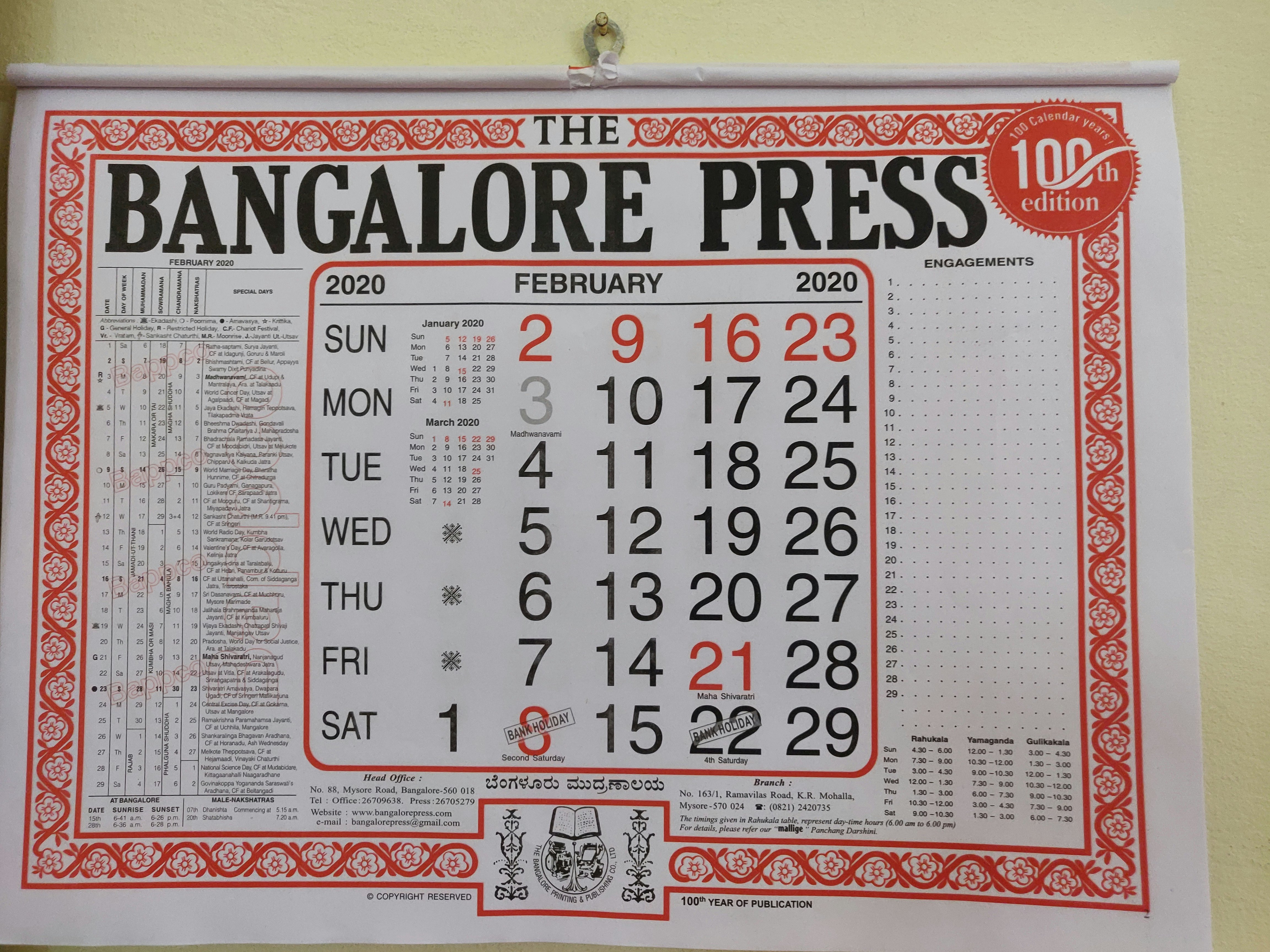 A pioneer publishing and printing company established way back in 1916, the 2020 calendar from the house of The Bangalore Press marked its 100th year of uninterrupted publication.