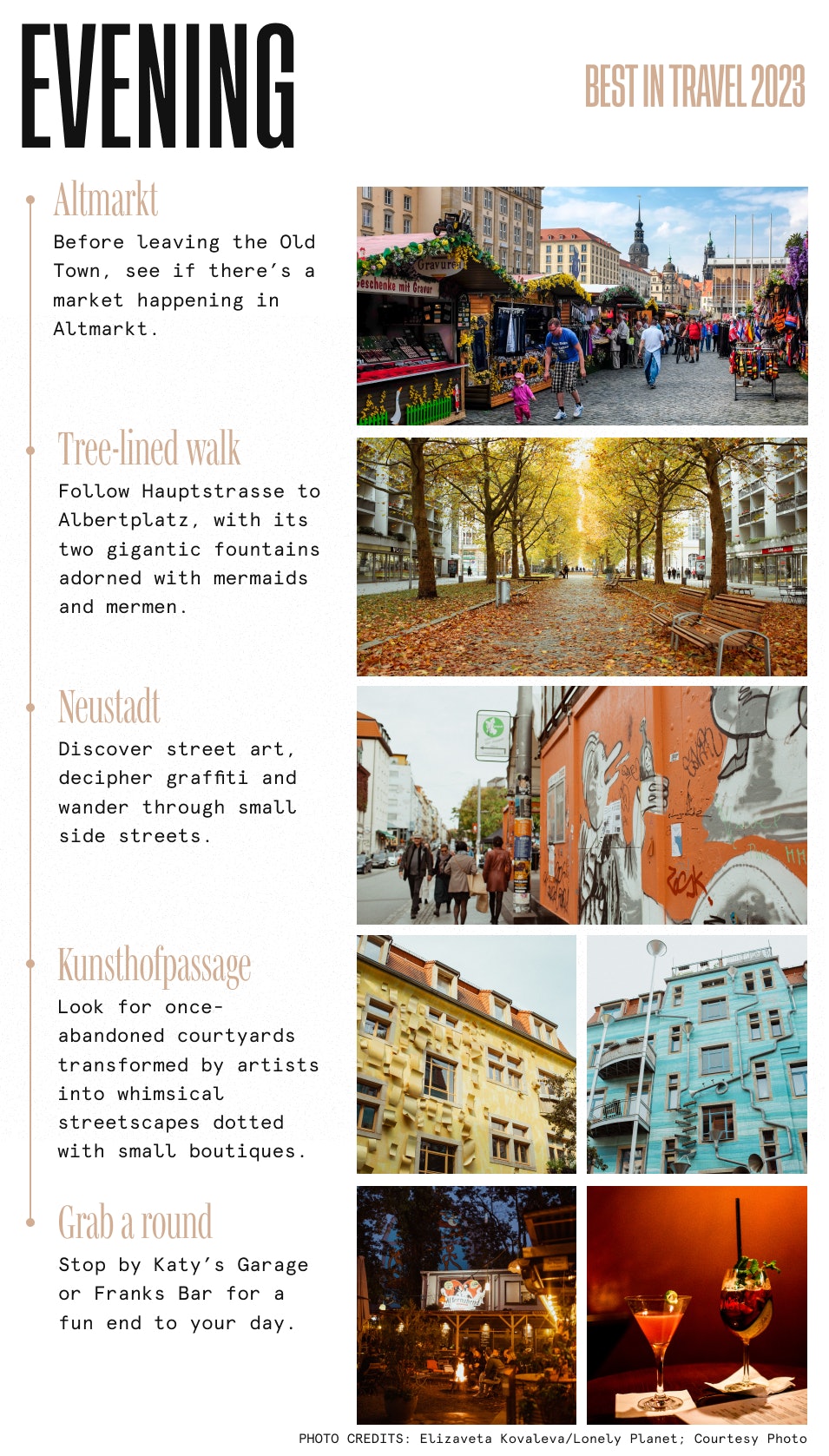 As you walk through Neustadt, your goal is to get as lost as possible, as you discover street art, decipher graffiti, wander through small side streets and stumble across charming courtyards such as Roskolnikoff, a small restaurant that seems to have never been informed of East Germany’s fall. Look for the Kunsthofpassage, a series of connected, once-abandoned courtyards transformed by artists into whimsical streetscapes dotted with small boutiques.