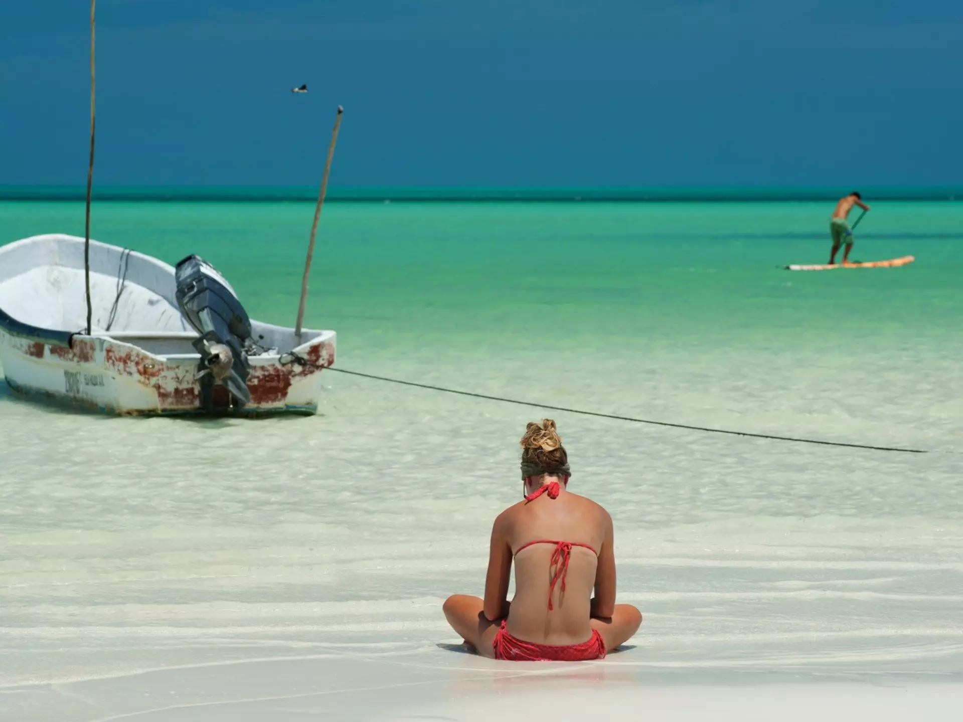 Looking out over the gulf, the north shore of Isla Holbox is fringed with sugar-fine sand, which gives way to the gently shelving azure Caribbean Sea.
