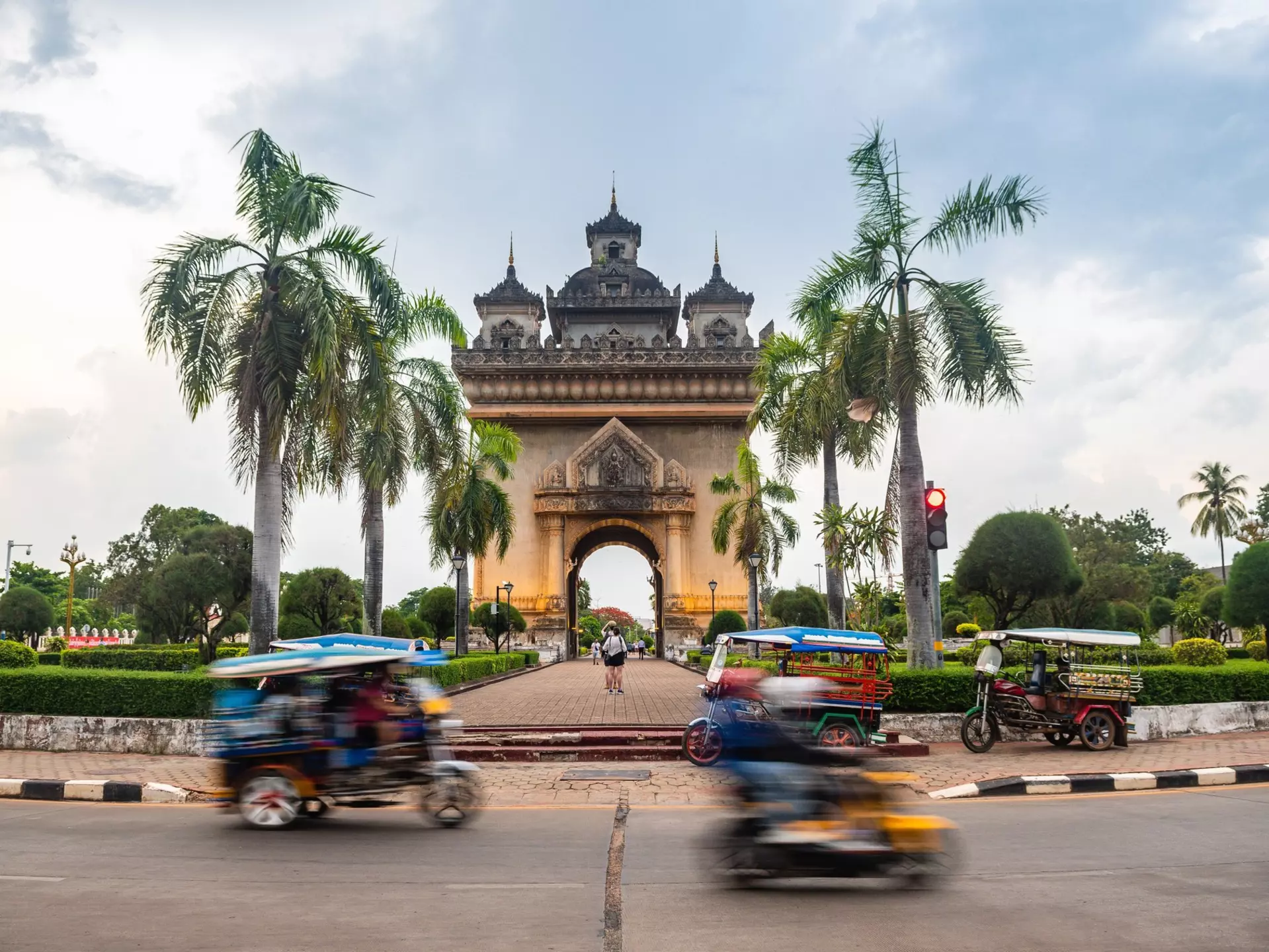 Tuk-tuks pass the Patuxai monument in central Vientiane, Laos. Jon Chica/Shutterstock