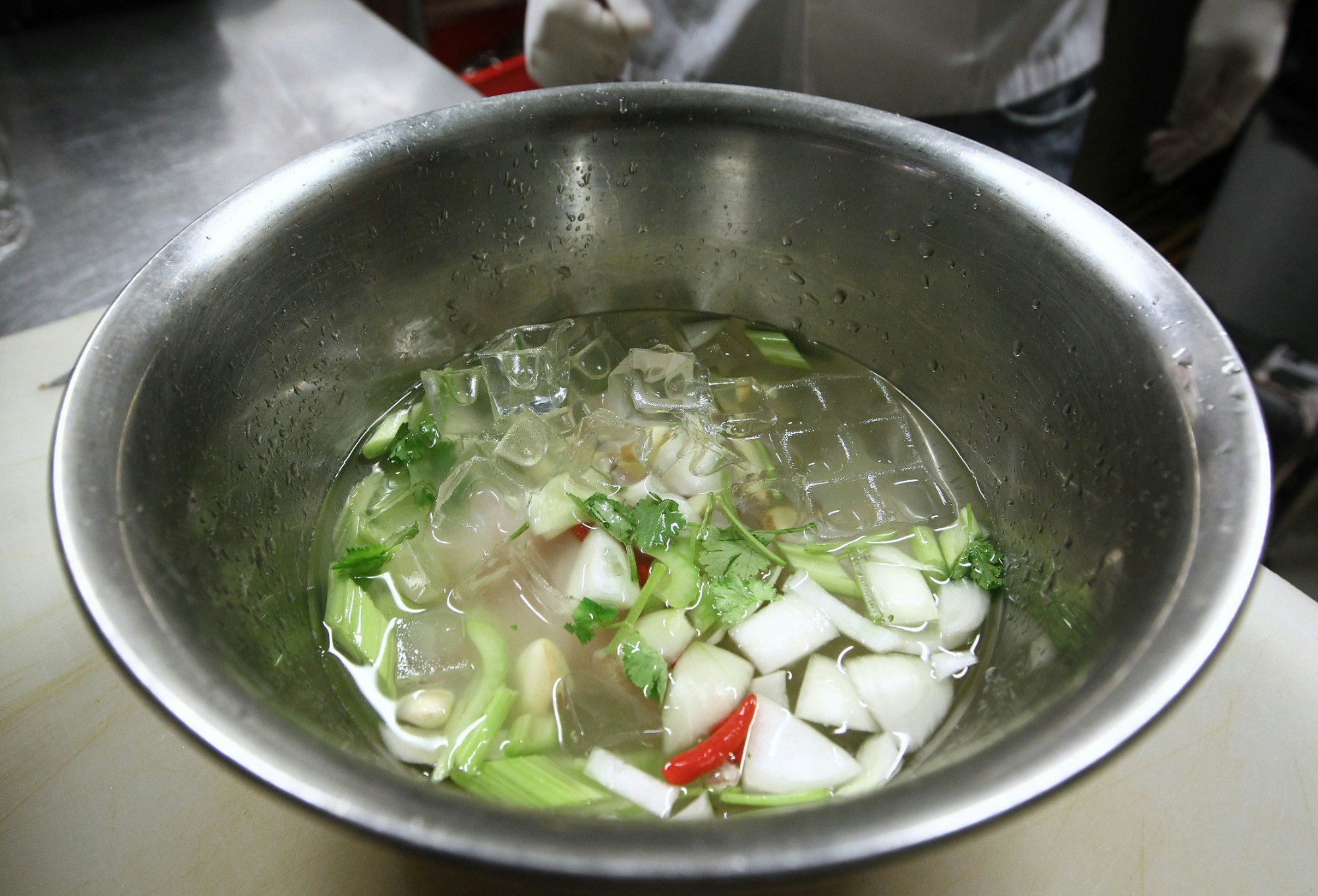 Also known as ‘tiger’s milk’, this fishy and spicy juice comes from the leftover marinade for ceviche, the Peruvian dish of fresh raw fish cured in citrus juice. The key ingredients are fish stock, pieces of firm white fish, garlic, coriander, onion, chilies, salt, pepper and the all-important lime juice. Its acidity and spiciness are believed to kick the senses and the stomach to touch and the drink is also prized as an aphrodisiac.