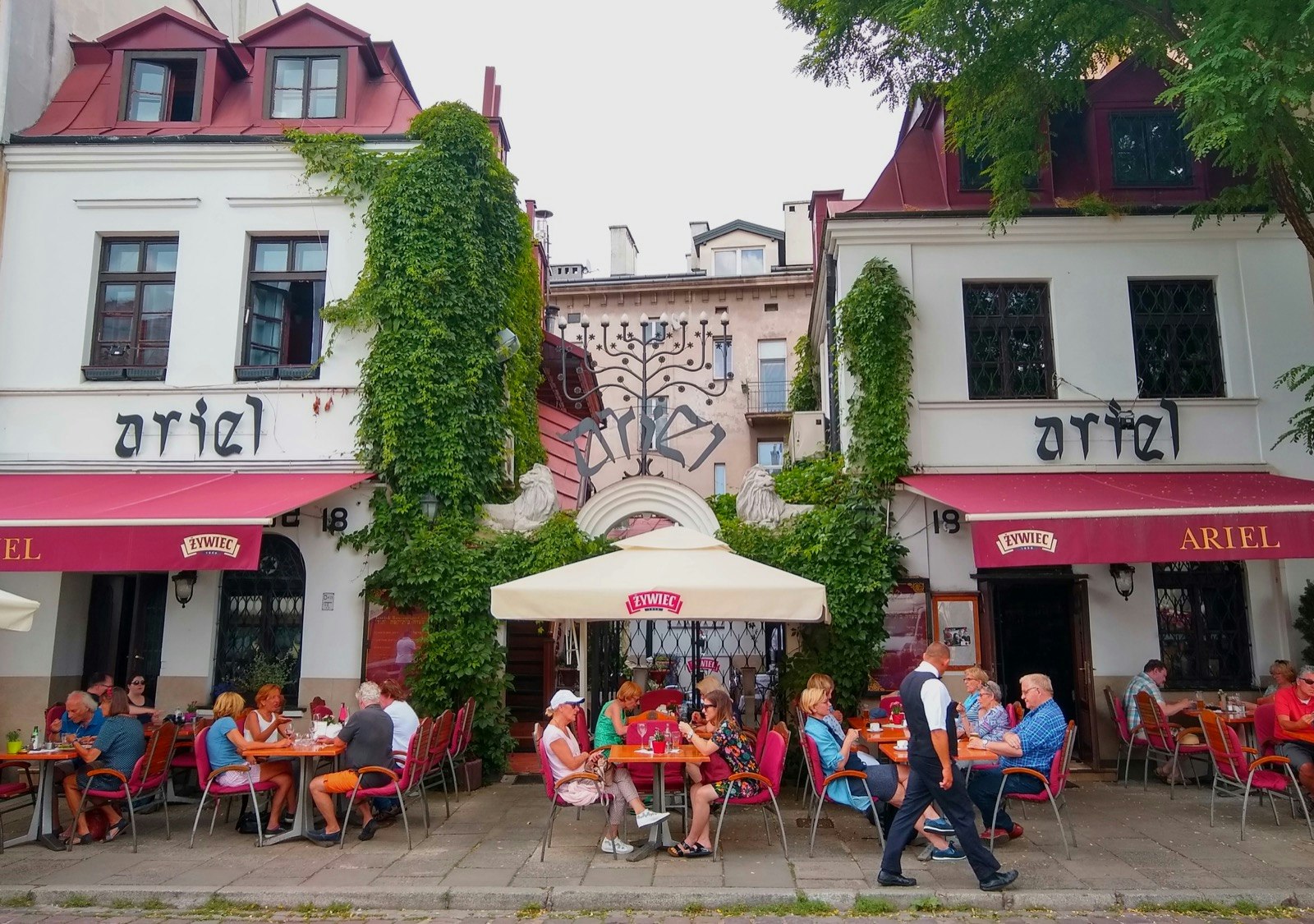 Szeroka street, once the hub of daily Jewish life in old Kazimierz, is now a walking area lined with Jewish, Polish, and Israeli restaurants. Ariel, one of the biggest and most authentic Jewish restaurants in town, offers a full menu of Yiddish classics from chopped liver to gefilte fish, with impressive old-world decor and live klezmer music.