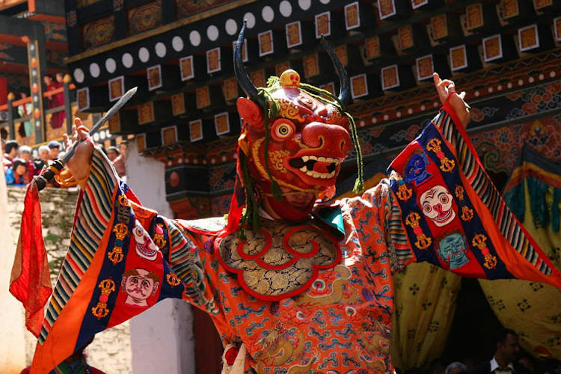 A Buddhist monk practices a traditional mask dance. ryosho/Shutterstock