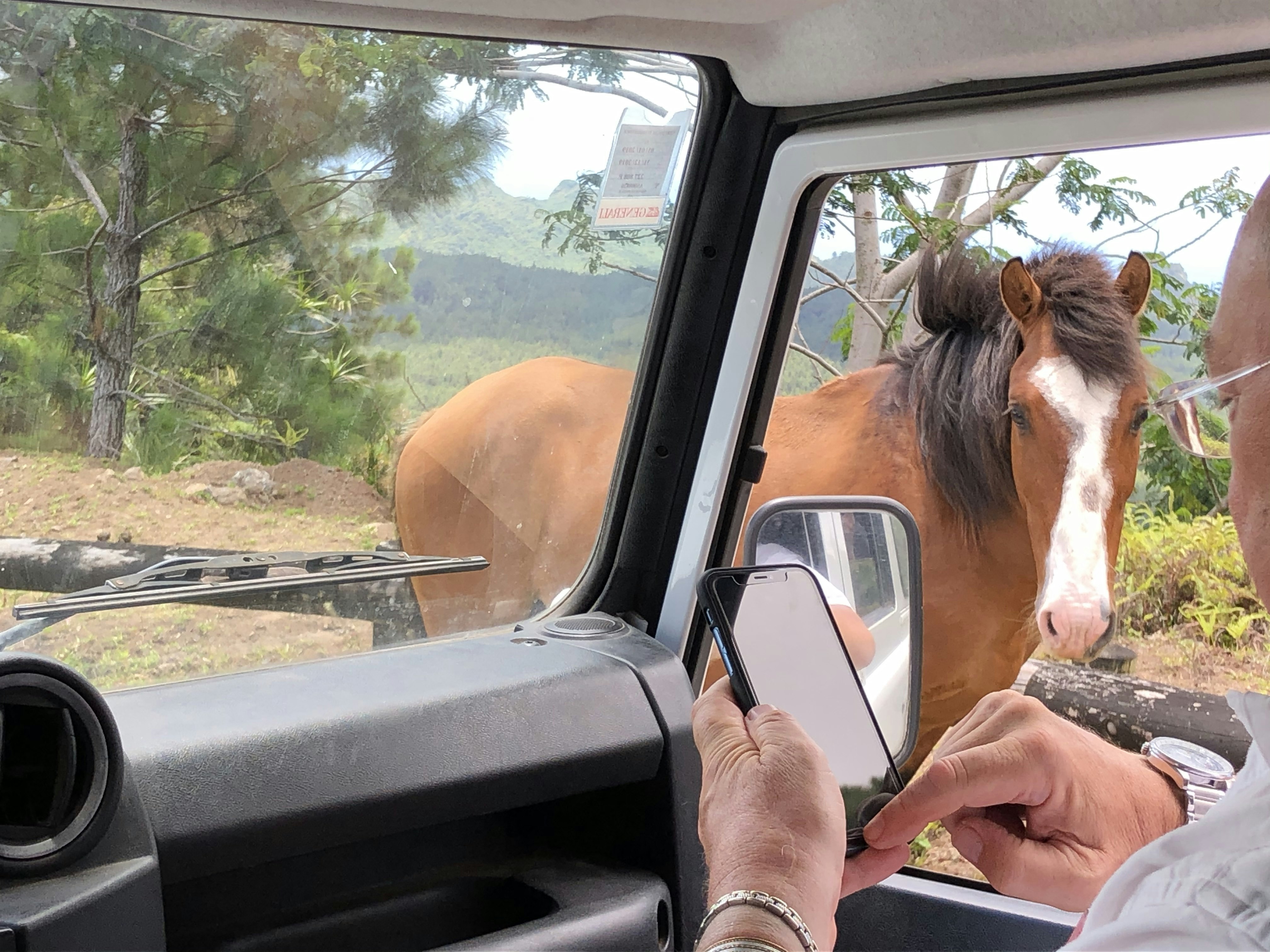 It is another half an hour until we reach the bay. Civilisation does not build up slowly; there is no gradual appearance of more buildings, no stretches of farmland to indicate civilisation. Here, the population is condensed into a few key areas, and the rest is bush. A horse without a saddle is tied to a tree, staring at us like a spaniel tied up outside a Tesco Express.