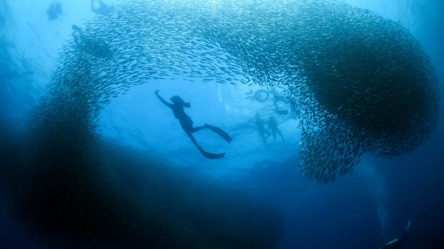 So sardines aren’t your quintessential tropical fish. These scaly creatures are more likely to conjure up images of fish markets or squeezing onto your commuter train. Instead, envisage luminescent, ethereal figures swirling beside you, against a deep blue backdrop.
