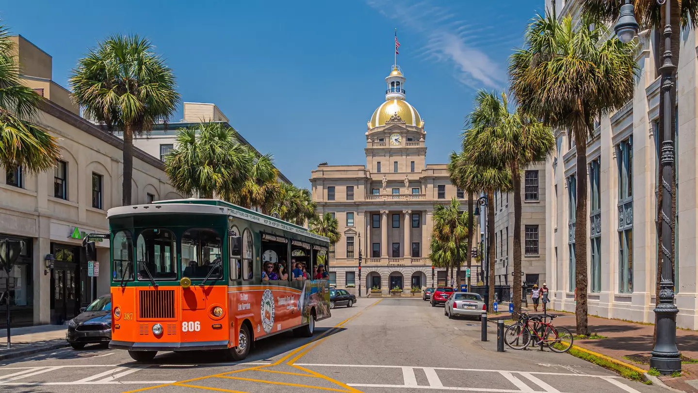 A trolley tour bus rolls through downtown Savannah, Georgia. Darryl Brooks/Shutterstock