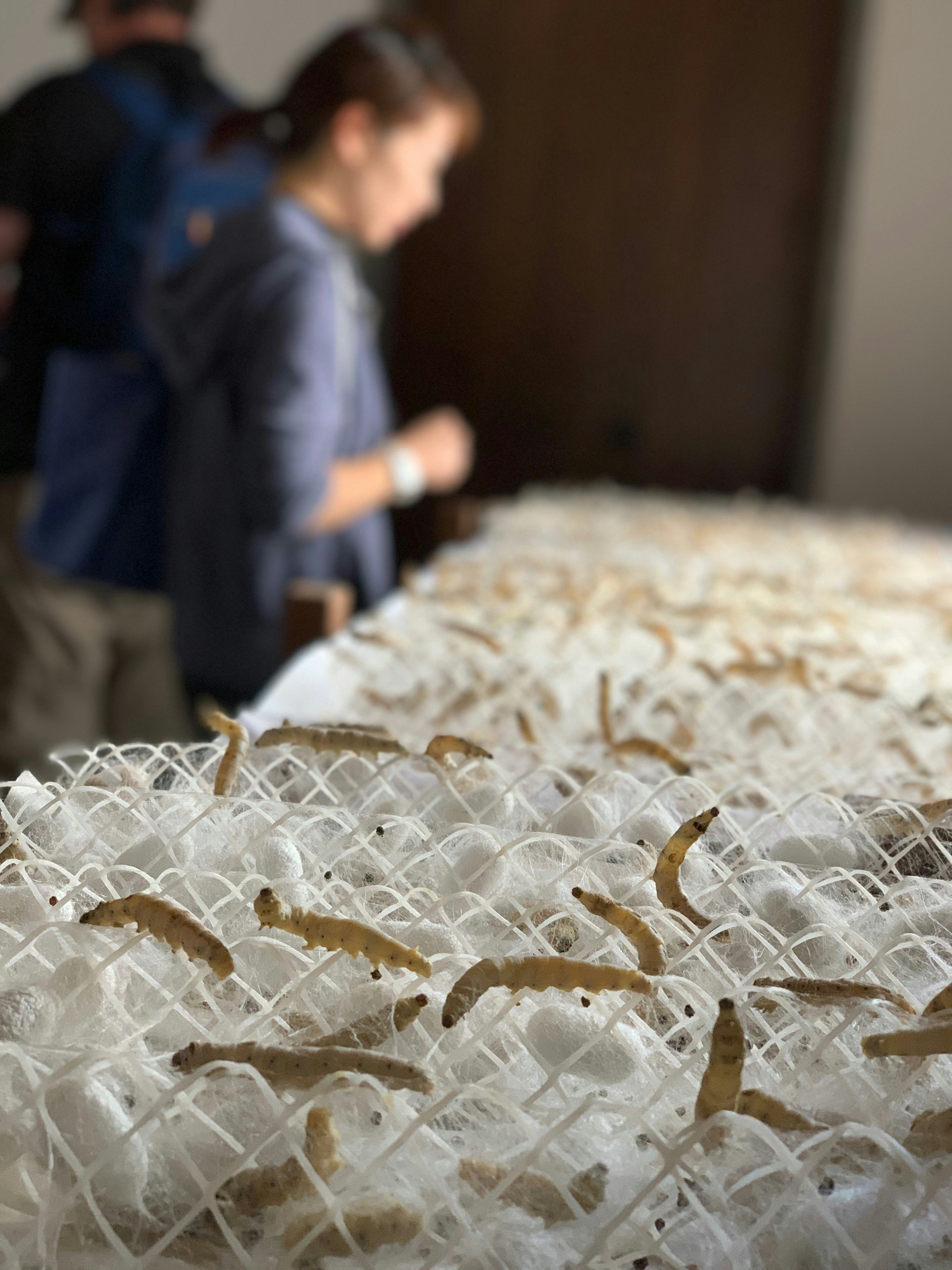 A close-up shot of silkworms on a pile of silk in a factory in Suzhou. In the background, a blurred figure is visible.