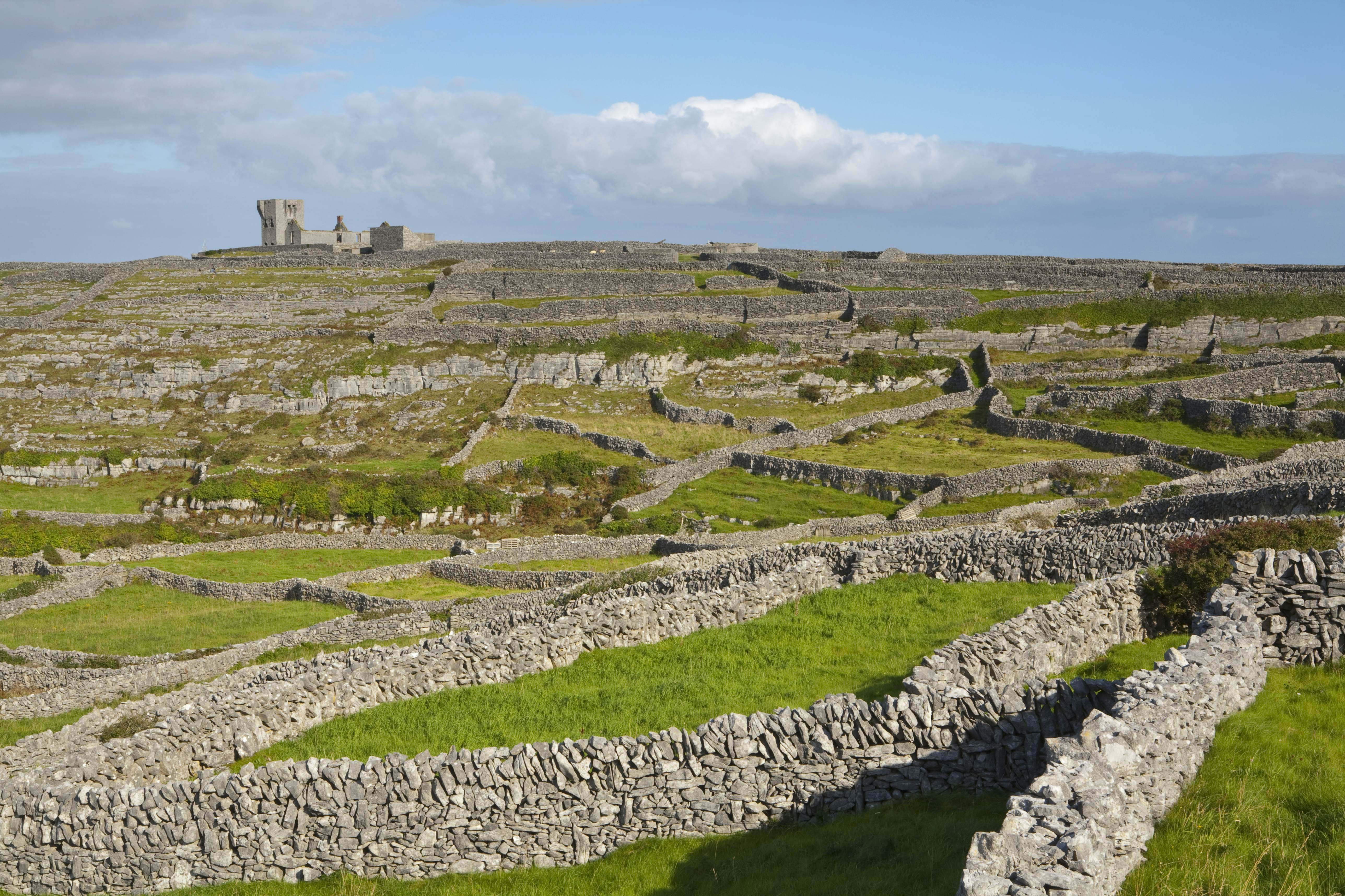 The three Aran Islands – Inishmore (the largest of the three, which translates as “big island”), Inishmaan and Inisheer – lie at the mouth of Galway Bay, and offer visitors the most Irish of Irish experiences: lush green fields, breathtaking cliffs, prehistoric churches and the occasional traditional music session.