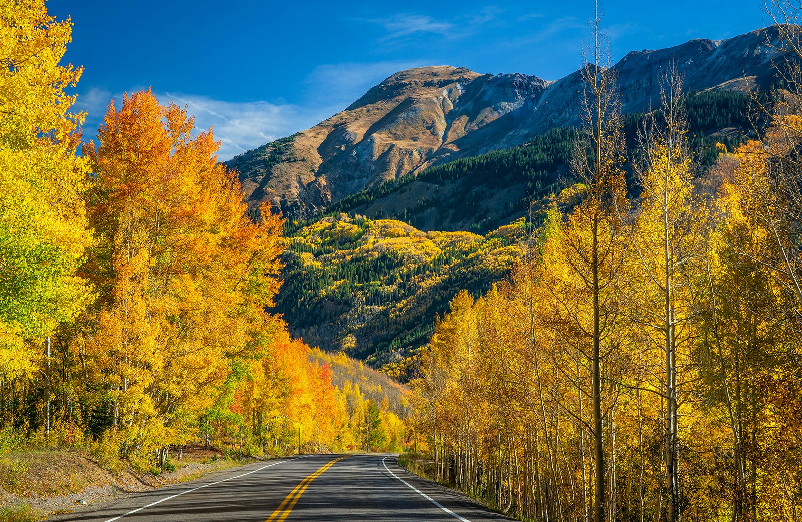 Charming Ouray sits at nearly 7800ft, surrounded by lofty peaks. It also fronts the Uncompahgre Gorge, a steep, rocky canyon famous for its ice climbing. While here, take a hike or soak in the town's hot springs. From Ouray, the Million Dollar Hwy – completed in 1884 after three years of construction – hugs the side of the gorge, twisting past old mines that pock the mountainsides. Stay vigilant for the masochistic, spandex-clad cyclists pumping over the passes on the ribbon-thin road. In Silverton, step away from the car and enjoy the aspen-covered mountains or watch the steam-powered Durango & Silverton Narrow Gauge Railroad chug into town.