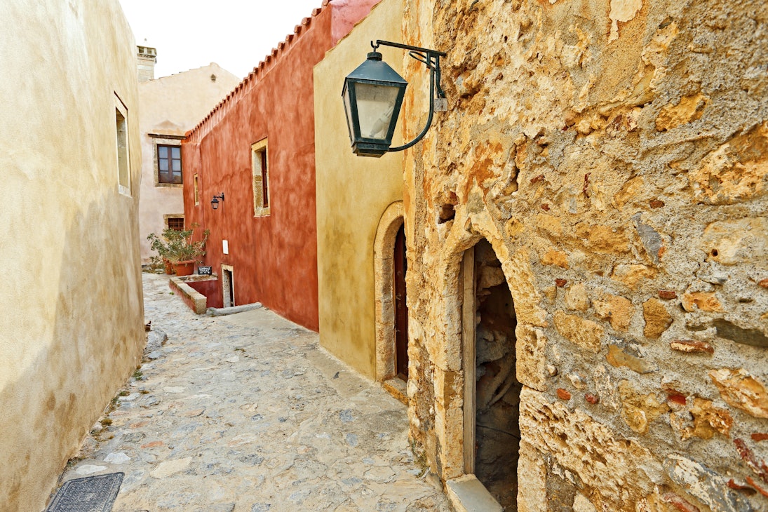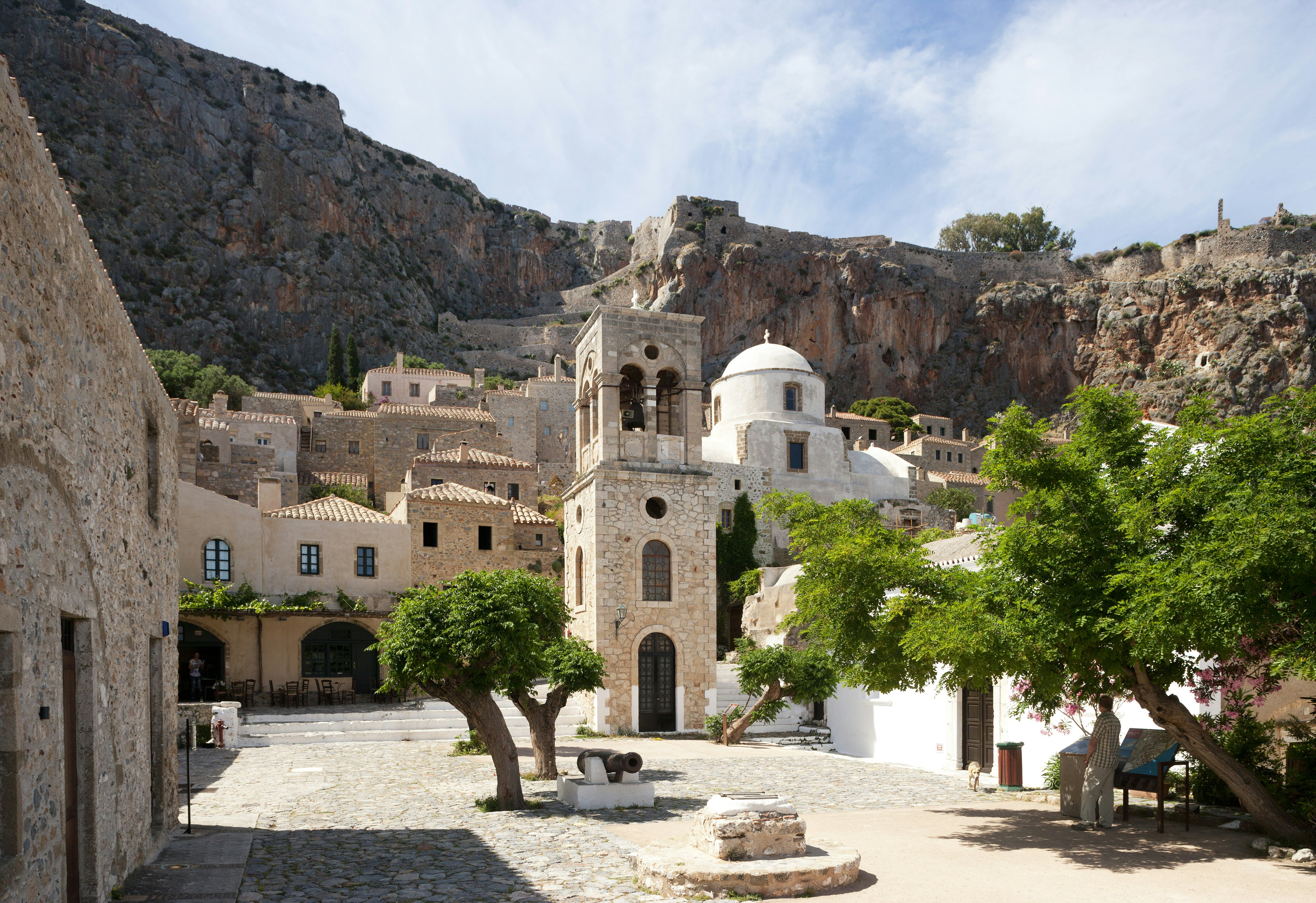 Surrounded by the teal waters of the Aegean Sea, imposing Monemvasia is an iceberg-like slab of rock, with sheer cliffs rising hundreds of metres from the sea, linked to the mainland by a single, highly defensible causeway.
