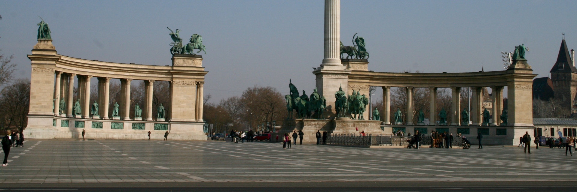 Heroes’ Sq is the largest and most symbolic square in Budapest. It is dominated by the Millenary Monument (Ezeréves emlékmű), a 36m-high pillar topped by a golden Archangel Gabriel, holding the Hungarian crown and a cross. At the column's base are Prince Árpád and six other Magyar chieftains who occupied the Carpathian Basin in the late 9th century. The 14 statues in the colonnades behind are of rulers and statesmen – from King Stephen (far left) to Lajos Kossuth (far right).