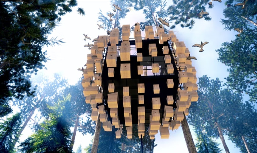 Sweden's fanciful Treehotel is branching out with a new room. Perched atop the forest, the latest installment is covered in 350 bird boxes to increase the local bird population (and create an interesting alarm clock for guests).