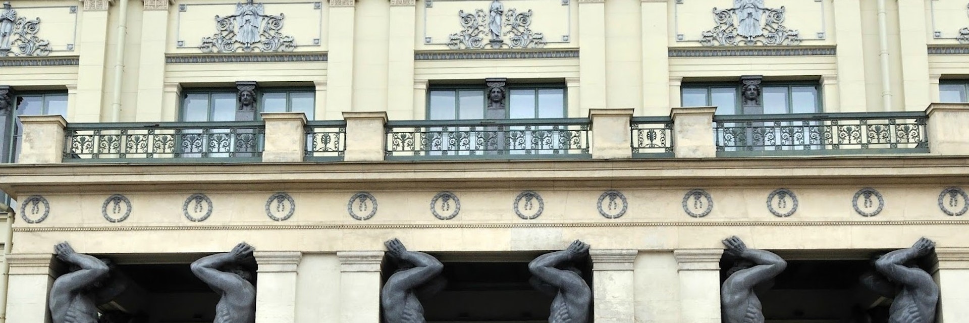The New Hermitage's original entrance has a portico supported by monumental Atlantes carved from grey granite in the workshop of Alexander Terebenev.