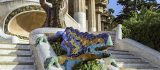 Arriving via the park's main eastern entrance, you'll reach a broad open space, the Plaça de la Natura, whose centrepiece is the Banc de Trencadís, completed in 1914. Curving sinuously around the perimeter, this multicoloured tiled bench was designed by one of Gaudí’s closest colleagues, architect Josep Maria Jujol (1879–1949). To the west of the square extends the Pòrtic de la Bugadera (the Laundry Room Portico), a gallery where the twisted stonework columns and roof give the effect of a cloister beneath tree roots – a motif repeated in several places in the park.