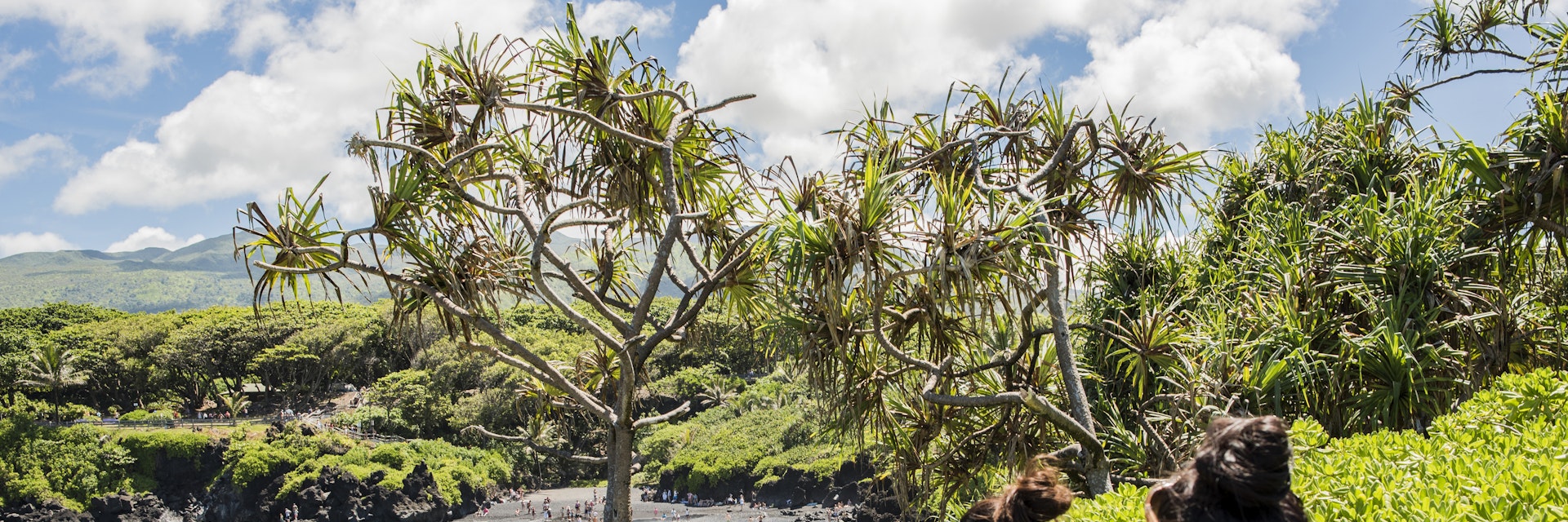 Wai'anapanapa means 'glistening waters', and the clear mineral waters in the cave pools here will leave you feeling squeaky clean. There's a natural lava arch on the right side of Paʻiloa Bay, bordered by low rocky cliffs and a coastal trail with ancient lava stepping stones and a blowhole. Two impressive lava-tube caves are just a five-minute walk from the parking lot.